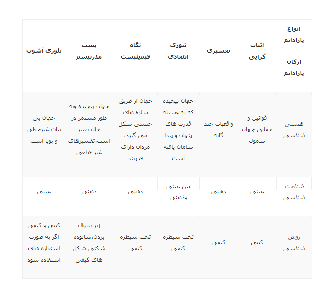 انواع پارادایم بر اساس ارکان(هستی شناسی،شناخت شناسی و روش شناسی) آن در یک نگاه